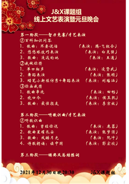 组织举办2022年元旦云端跨年晚会,分为本科生跨年演唱会和研究生文艺晚会两个线上会场,院党委副书记刘徐、副院长蒋玮、学办全体辅导员及630余名本科生和研究生参加了这场意义非凡的文艺盛宴。