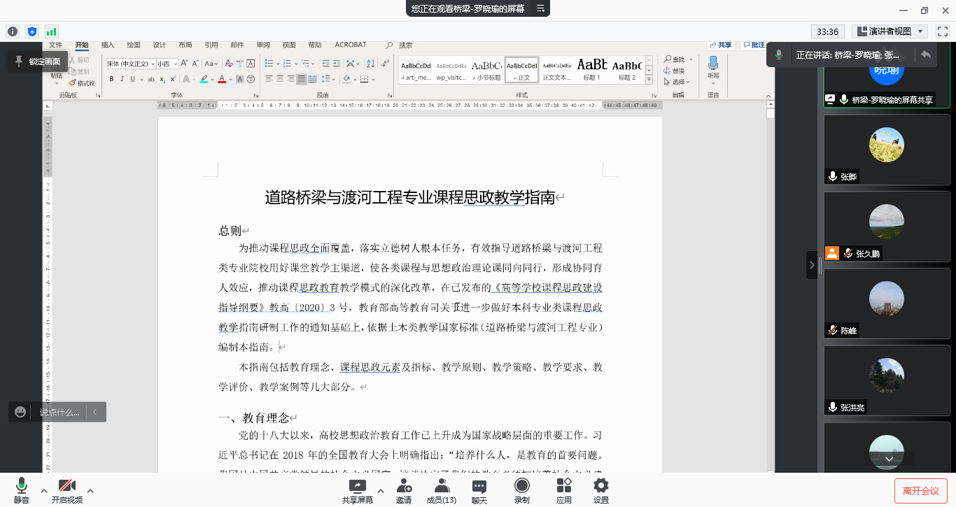 道路桥梁与渡河工程专业课程思政教学指南》编制情况。与会人员结合教育教学实际,就此开展了深入研讨和交流,提出了诸多有益的意见和建议,为进一步修订完善奠定了基础。
