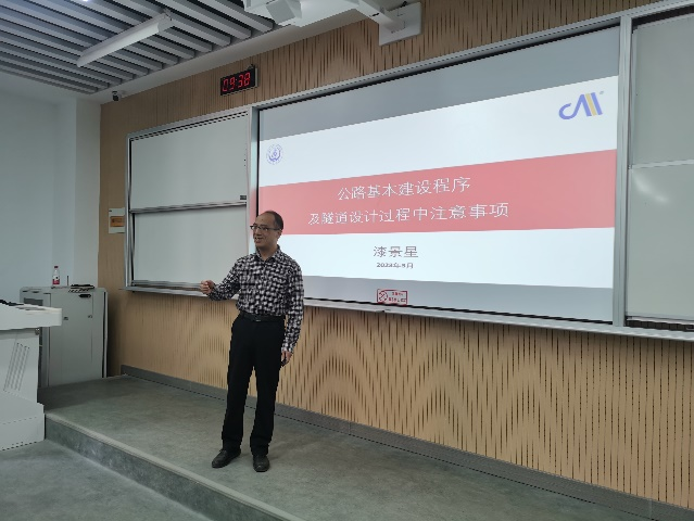 3月14日,胡建荣对2022届道路方向全英文毕业设计校企联合指导进行了简要总结,对2023届本科毕业设计校企联合指导提出了要求。高级工程师周茂以310国道眉县至渭滨一级公路为例,详细讲述了路线方案设计及关键性技术问题处理。