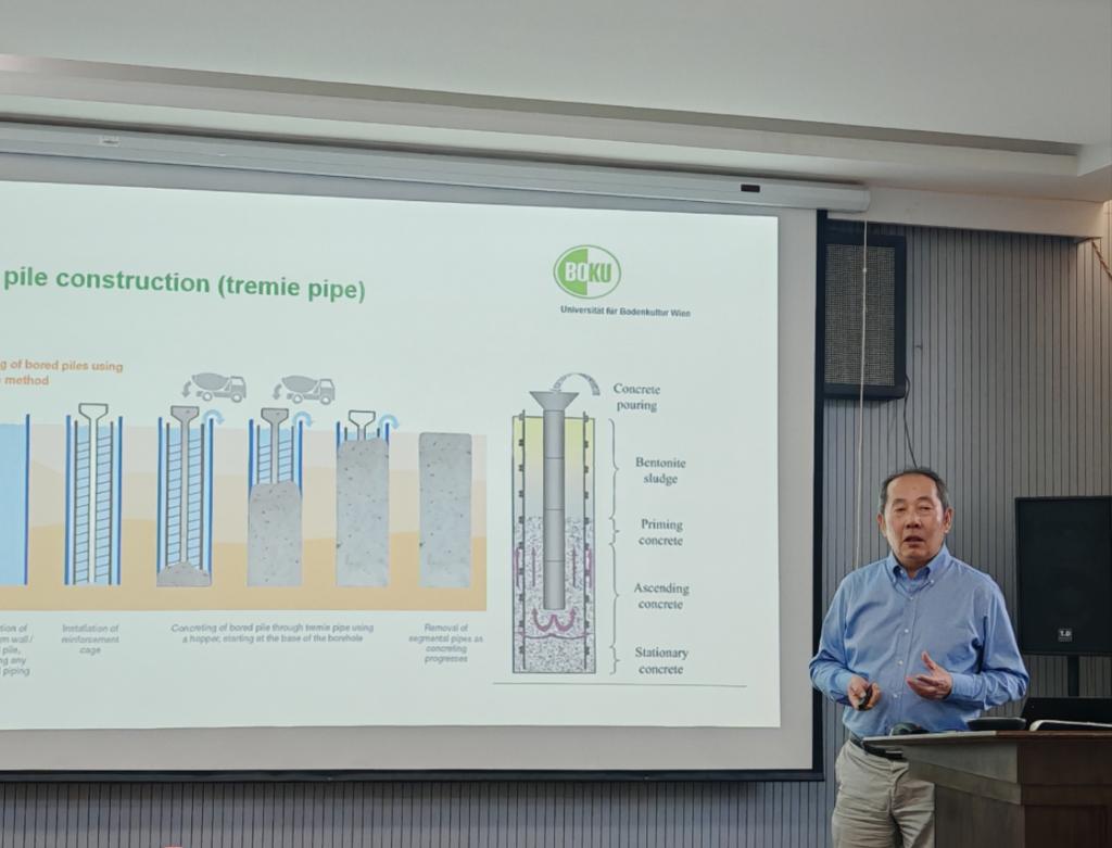 4月21日上午,吴伟教授为师生们带来了题为“Recent study on quality of bored piles”的学术报告。吴教授介绍了团队在过去十年中关于新拌混凝土泌水问题的研究工作,重点分享了灌注桩中混凝土孤立波的试验验证及数学解析的研究成果。报告结束后,师生们与吴教授围绕相关学术问题进行了深入探讨。