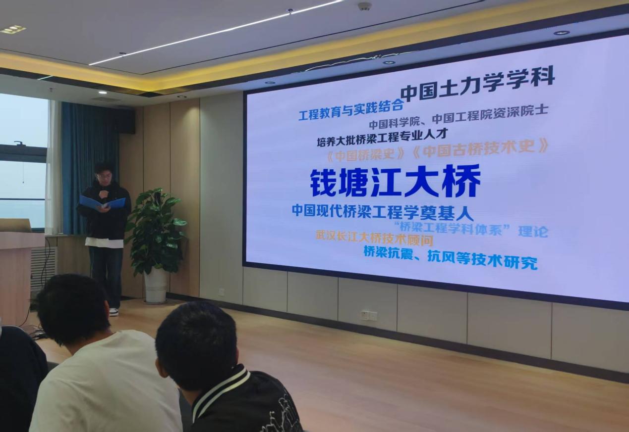 何子康同学带领全体师生回顾了茅以升先生的生平事迹。他生动讲述了茅以升先生“学桥、造桥、写桥”的不凡人生,尤其是主持设计钱塘江大桥时“炸桥复桥”的爱国壮举,展现了先生“国为重、桥为轻”的崇高精神。何子康还结合伦理影片