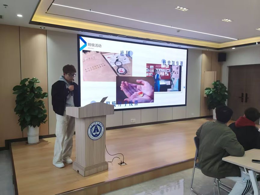 高浩博同学就班级建设的思考与展望进行分享。他回顾了开学以来的班级活动,如新生军训锤炼意志、心理团辅打破隔阂、社团参与发展兴趣、参观校史馆传承精神等,强调了集体成长的重要性。高浩博特别提到,班级中有22名同学递交了入党申请书,展现了追求进步的思想觉悟,希望大家携手共建一个充满归属感和荣誉感的班集体。