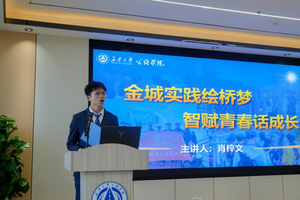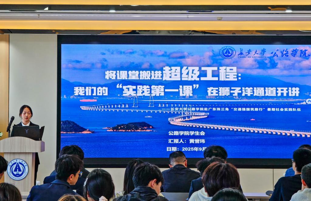 赴广东珠三角“交通强国筑路行”暑期社会实践队黄誉玮同学以《将课堂搬进超级工程:我们的“实践第一课”在狮子洋通道开讲》为题进行分享。今年暑期,该支队伍走进拥有世界五项第一的狮子洋通道等国家重大工程,深刻感悟到当年青年应勇于在艰难险阻中挑起重担,在祖国最需要的地方挥洒青春。
