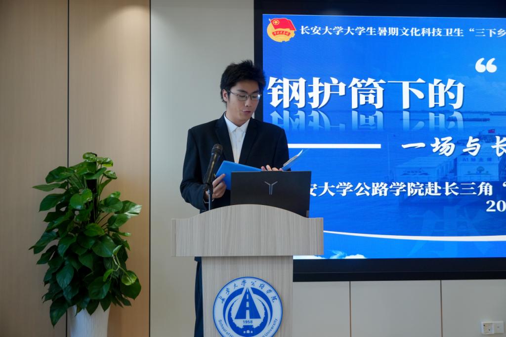 赴长三角“交通强国筑路行”暑期社会实践队相欣宇同学带来了题为《钢护筒下的“定海神针”:一场与长江的硬核对话》的分享,讲述了张靖皋长江大桥的建设故事。张靖皋长江大桥凭借技术创新创下六项世界纪录,成为世界悬索桥技术的新巅峰,更是一代代建设者们用汗水和智慧连接过去与未来、沟通梦想与现实的象征。