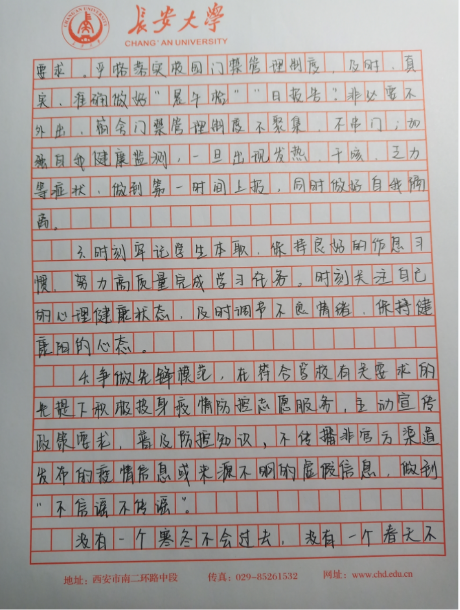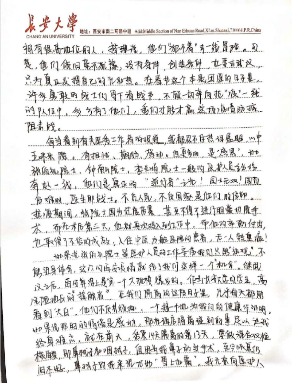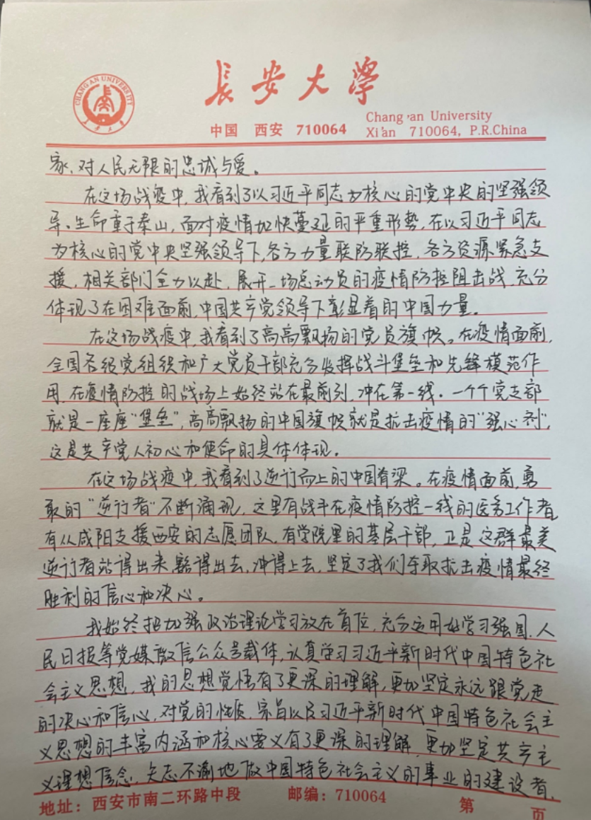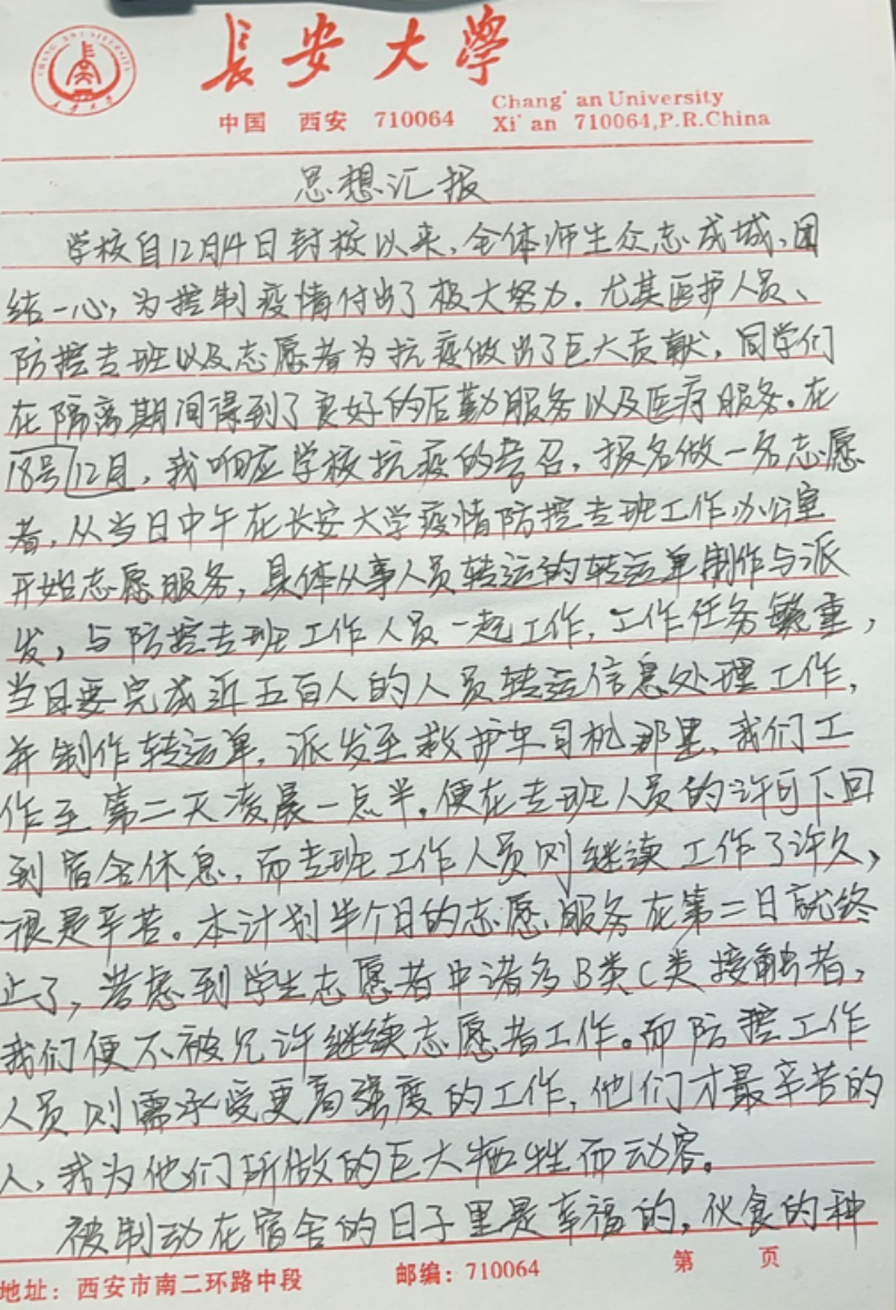 硕1901党支部预备党员吴征在思想汇报中表达了自己在不能继续做志愿者后的遗憾,同时也写道:“考虑到学生志愿者中存在诸多B、C类接触者,便不被允许继续志愿者工作。而防控工作人员则需要承受更高强度的工作,他们才是最辛苦的人,我为他们所作的巨大牺牲而动容。
